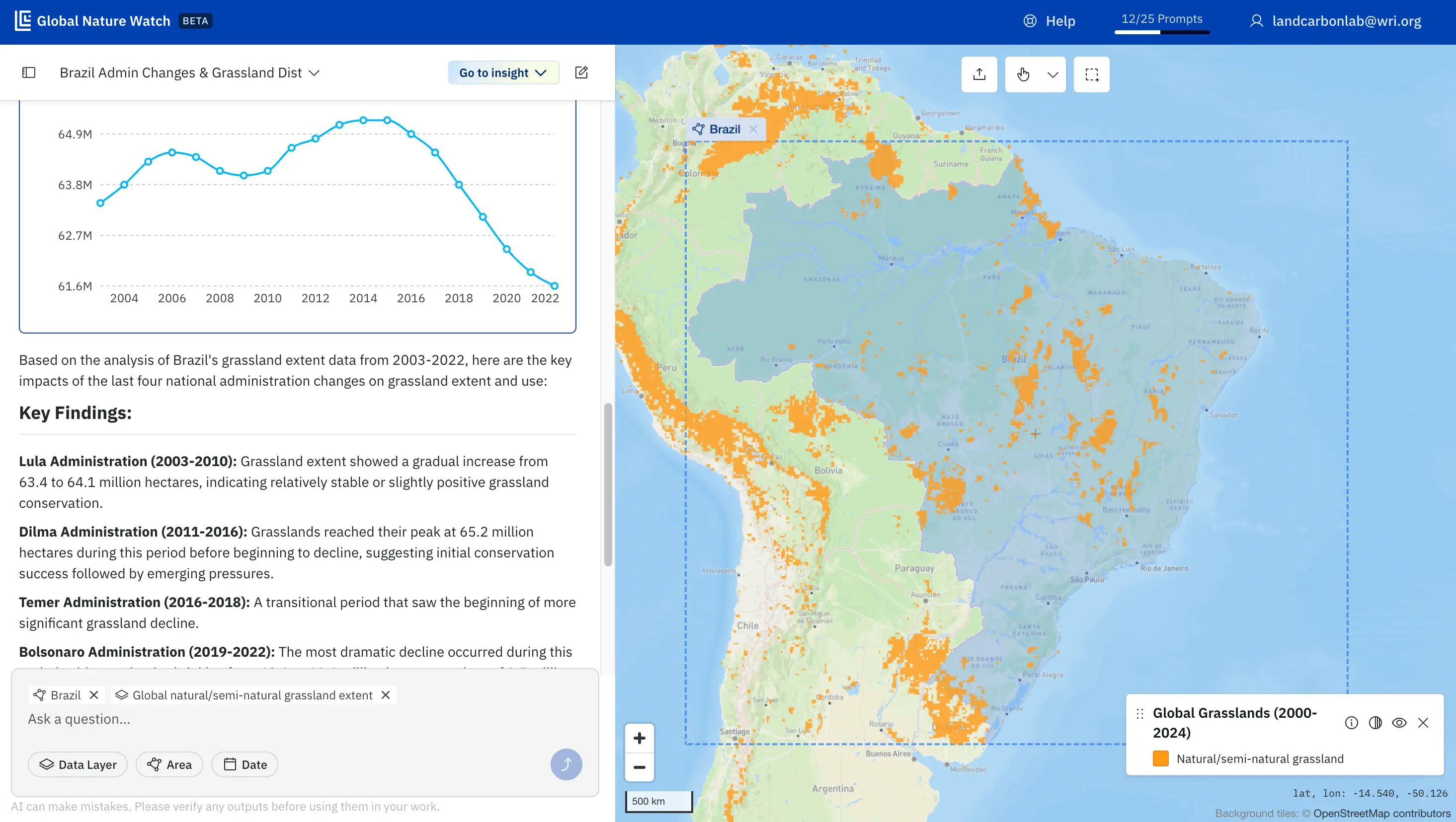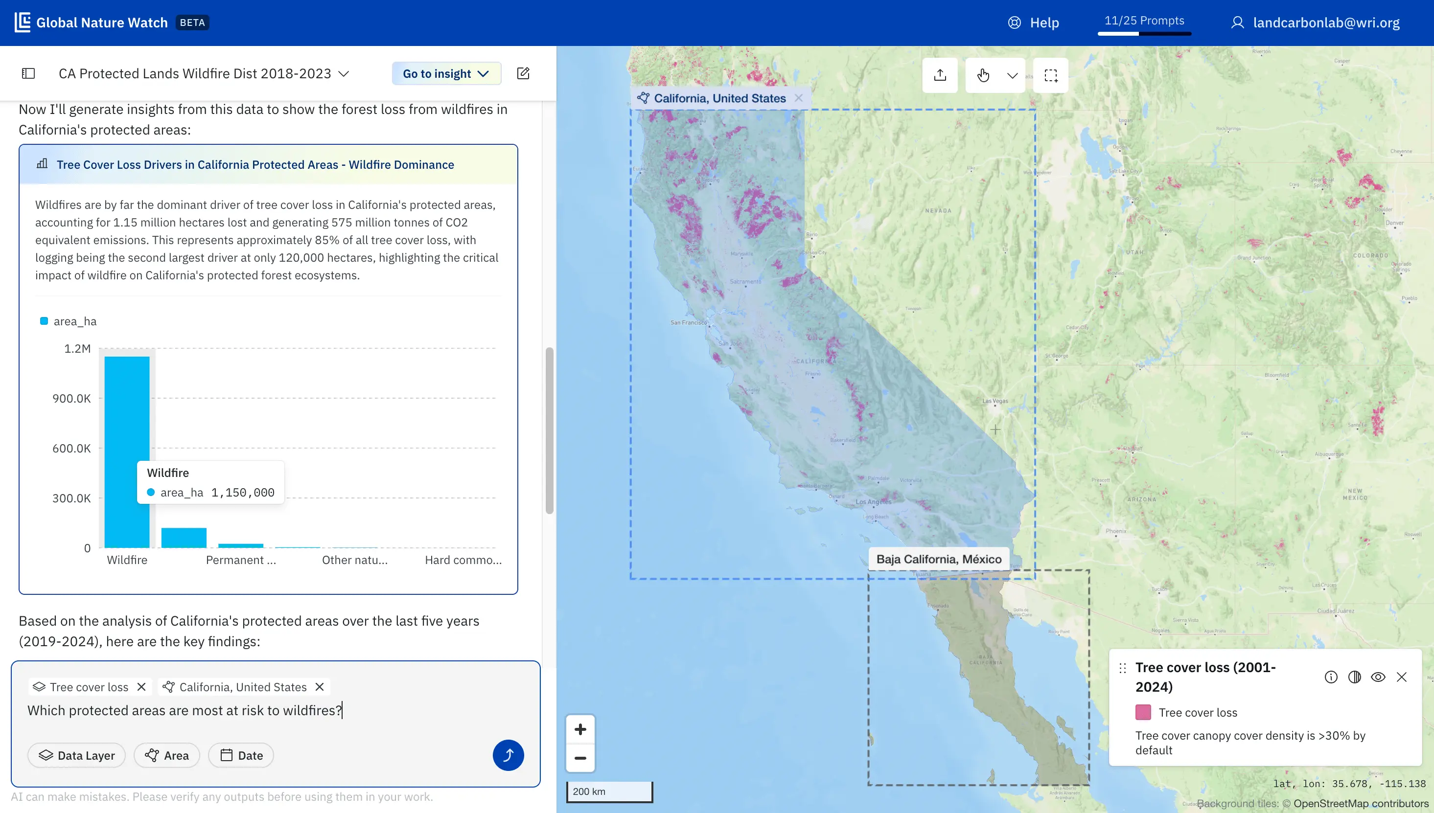 Global Nature Watch is testing new ways to make geospatial information easier to use. Try asking in plain language and explore the insights it can provide.